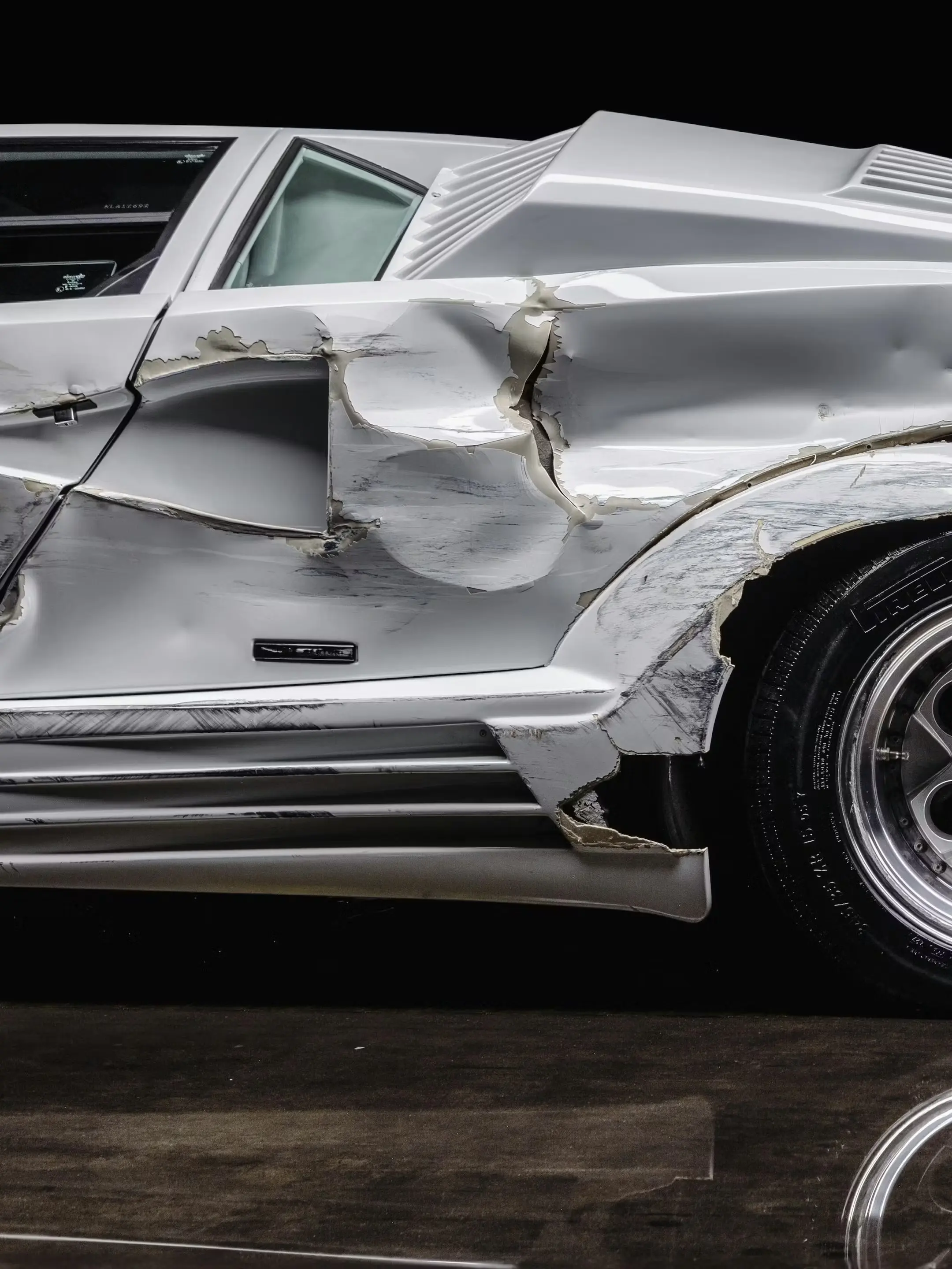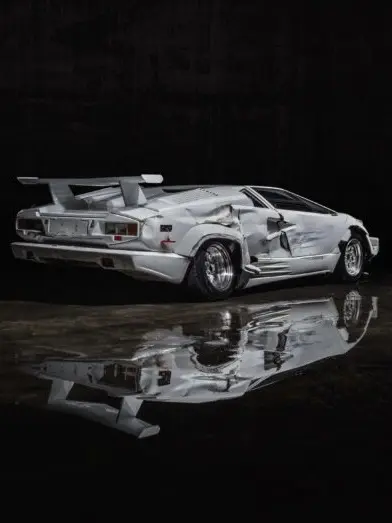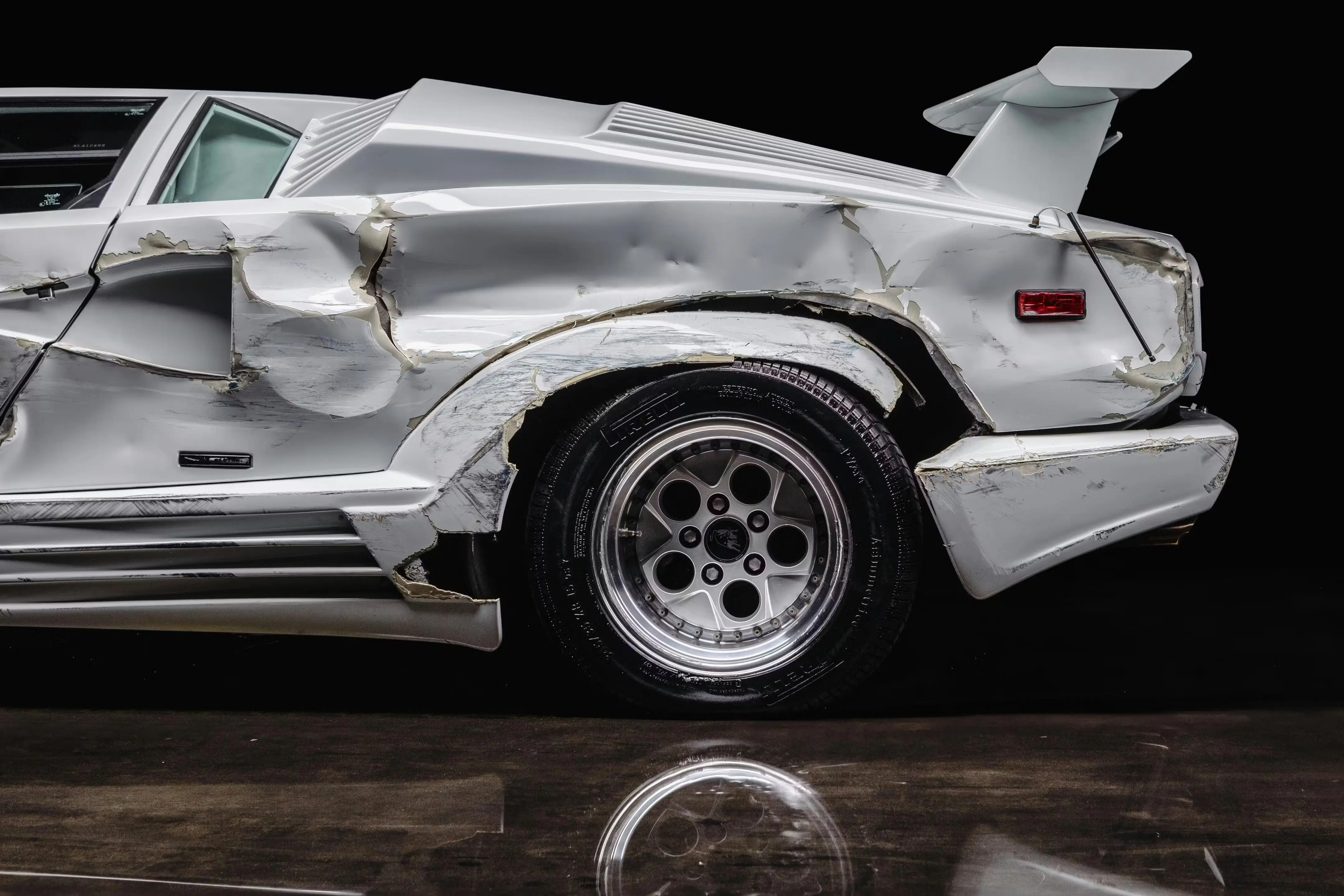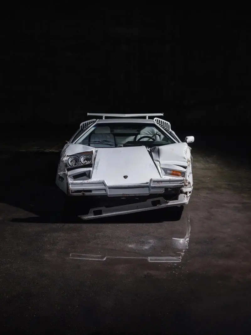La Countach est retrouvée complètement ravagée, pare-chocs arraché, carrosserie enfoncée, phares détruits.